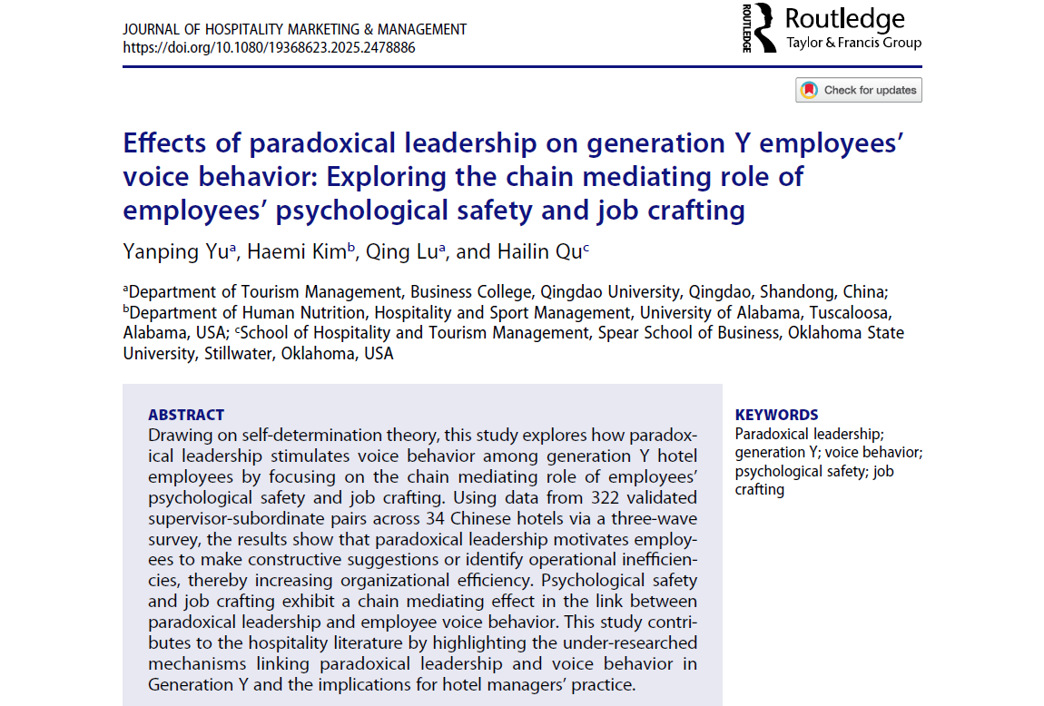近日,必赢nn699net旅游管理系教授于岩平(第一作者,通讯作者)团队与美国阿拉巴马大学助理教授Kim Haemi、美国俄克拉荷马州州立大学屈海林终身教授合作完成的原创性研究成果“Effects of paradoxical leadership on generation Y employees’ voice behavior: Exploring the chain mediating role of employees’ psychological safety and job crafting”在国际权威期刊Journal of Hospitality Marketing & Management(JCR一区,影响因子11.0)上正式发表,必赢为第一作者和通讯作者单位。