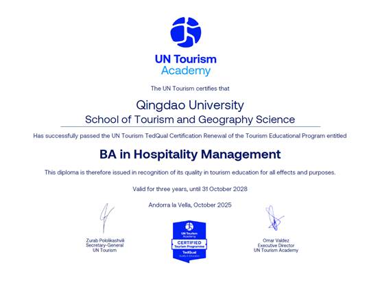 11月1日,我校收到联合国旅游组织旅游教育质量认证中心的正式通知,旅游管理和酒店管理两个本科专业再次成功通过联合国旅游组织旅游教育质量(UN Tourism TedQual Certification)认证,续期为三年。旅游管理和酒店管理本科专业于2022年5月首次通过联合国旅游组织旅游教育质量认证,此次获得三年续期认证,标志着我校旅游管理与酒店管理专业的人才培养质量和国际化办学水平持续获得全球权威认可。