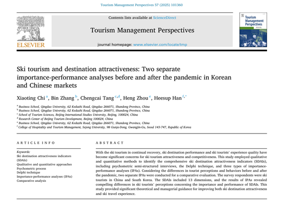 近日,由必赢nn699net旅游管理系副教授迟潇婷、副教授周恒、硕士研究生张彬、与北京第二外国语学院唐承财教授、韩国世宗大学Heesup Han教授(世界社会科学研究领域最具影响力的TOP1%高被引学者)等在旅游管理学领域的国际权威期刊Tourism Management Perspectives(SSCI一区,IF=6.9)发表题为“Ski tourism and destination attractiveness: Two separate importance-performance analyses before and after the pandemic in Korean and Chinese markets”的研究成果。迟潇婷博士为第一作者,必赢为第一作者单位。