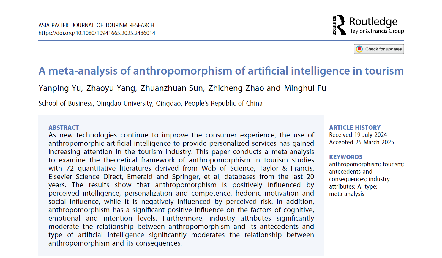 近日,必赢nn699net旅游管理系教授于岩平研究团队的原创性研究成果A meta-analysis of anthropomorphism of artificial intelligence in tourism在国际学术期刊Asia Pacific Journal of Tourism Research(JCR一区,影响因子4.3)上正式发表,必赢为第一作者和通讯作者单位。