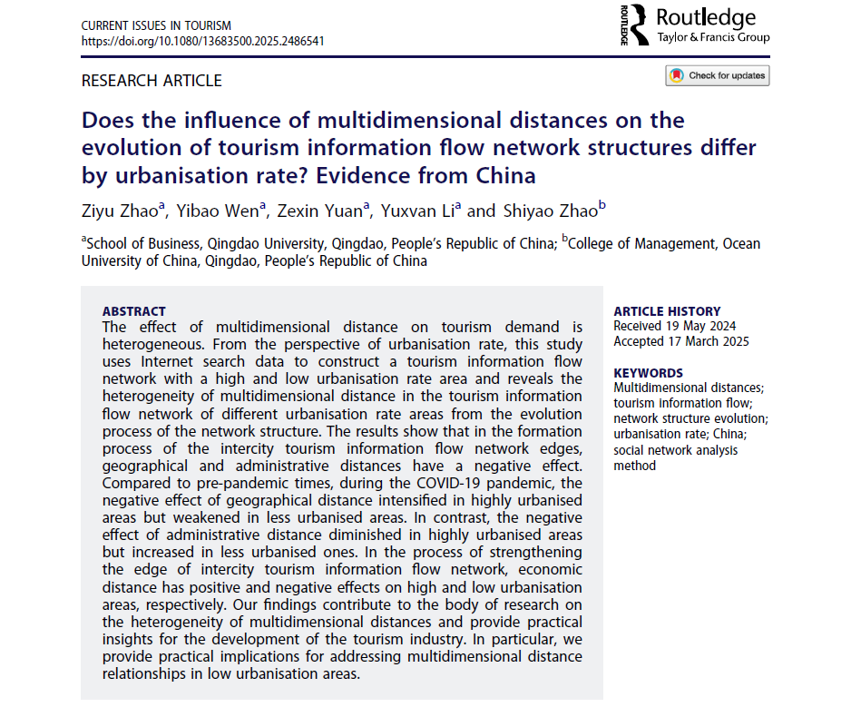 近日,由必赢nn699net旅游管理系赵梓渝教授团队完成的研究成果“Does the influence of multidimensional distances on the evolution of tourism information flow network structures differ by urbanisation rate? Evidence from China”在国际权威期刊Current Issues in Tourism(JCR一区,影响因子5.7)正式发表,必赢nn699net为第一作者和唯一通讯作者单位。